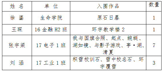 2019年,学校共征集到校园风景类和文化活动类师生摄影作品200余幅,经专家遴选,甄选出12幅作品入围2019年度计量图库。现以百度云共享形式供全校师生交流学习(地址:https://pan.baidu.com/s/1l66FtWnaVC_5YVu23gOycA及二维码),欢迎广大师生查看点评。现将入选者信息公布如下: