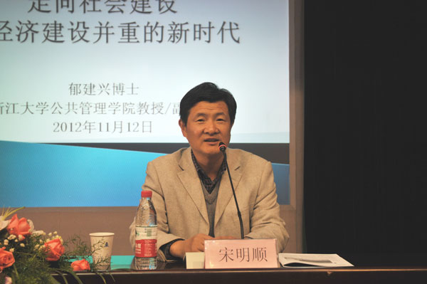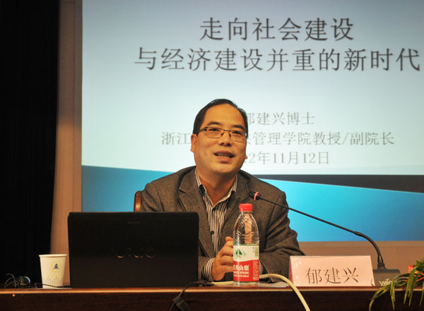 讲座中,郁建兴为大家阐释了社会建设的内涵、体系及构建意义,以当前中国社会建设现状为发端,总结当前我国社会建设的基本经验。他认为,社会建设是指社会主体根据社会需要进行的一种有目的、有计划、有组织地改善民生和推动社会进步的社会行为和过程,包括社会民生建设、社会管理创新、社会体制改革、社会能力建设四个方面。他把1978年以来的当代中国社会建设的基本经验,概括为“三个积极”,即积极转变发展理念和政府职能,积极创新公共事务的治理模式,积极推进体制改革和制度建设。