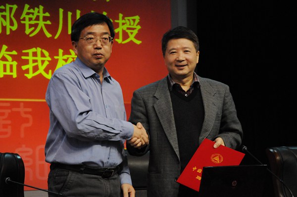 讲座开始前,法学院院长陶丽琴宣读了聘任郝铁川教授为我校客座教授的文件,俞晓平副校长颁发了聘书。