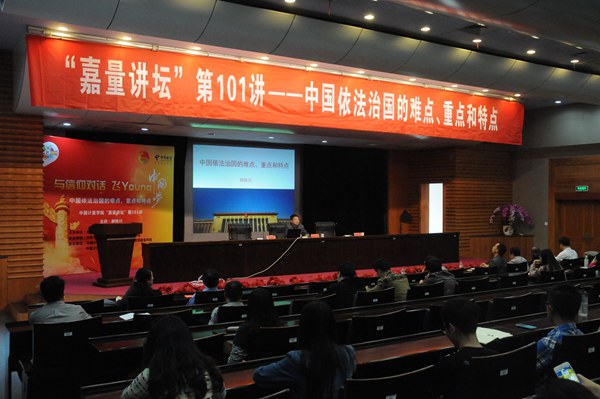 4月19日下午,上海市文史馆馆长郝铁川教授应邀主讲“嘉量讲坛”第101讲,在闻厅二楼报告厅为师生作了题为“中国依法治国的难点、重点和特点”的专题讲座。讲座由副校长俞晓平主持。