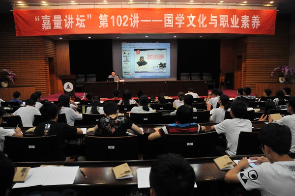 5月30日下午,嘉量讲坛第102讲在闻厅二楼报告厅举行。道德经讲师、国学应用领域讲师,浙江大学客座教授、总裁班导师、浙江文澜大讲堂客座教授道觉老师应邀走进“嘉量讲坛”,为师生进行“国学文化与职业素养”专题讲座。400余名师生到场聆听了讲座。