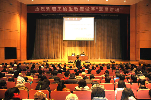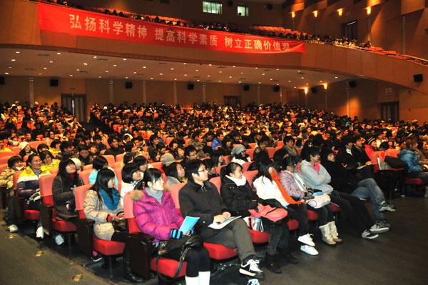 报告中,王渝生教授围绕弘扬科学精神、提高科学素质、树立正确价值观这三方面展开,以自己的亲身经历和渊博的知识,声情并茂地向听众讲述了什么是科学、我国公民科学素质的现状、提高科学素质的重要性以及大学生如何树立正确的价值观。王渝生教授诙谐幽默的演讲风格、深入浅出的论述、生动的引证,与台下的听众形成互动,给大家留下了深刻的印象,使同学们深刻地感受到了科学家的人格魅力和严谨的科学精神。王渝生教授告诉同学们,科学是一把万能钥匙。科学没有国界,但是科学家有祖国;科学没有阶级性,但是科学家有立场、有观点并且应具有社会责任感。只有科学精神与人文精神的结合才能实现个人的全面发展。报告最后,王渝生教授满怀激情地引用俄国文学家高尔基的名言,盛赞科学属于全人类、全世界,科学的真理放之四海而皆准,科学万岁,勉励大家要爱观察、爱试验,插上想象的翅膀,文理交融,多元并举,全面发展,奔向更加光辉灿烂的明天。