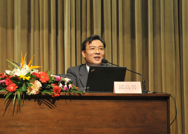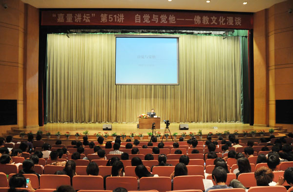 4月27日下午,我校人文社科学院院长邱高兴教授应邀来到嘉量讲坛,做了题为《自觉与觉他——佛教文化漫谈》的报告。1000余名师生参加了报告会,在邱教授平和的语调、温和的语气中感悟佛教文化。