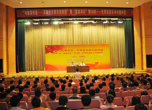 9月24日下午,由共青团中央、全国学联主办,共青团浙江省委和中国计量学院承办的“与信仰对话——万场党史报告进校园”活动在嘉量大会堂隆重举行。资深外交家吴建民为师生做了《世界的变化与中国外交》专题报告,校党委副书记陶伟华主持报告会。来自我校和下沙高教园区的1200余名师生代表参加了讲座。