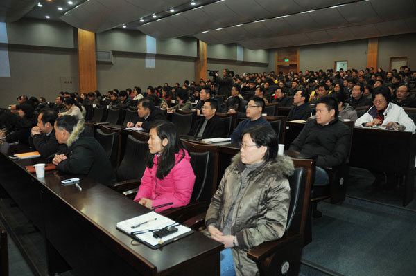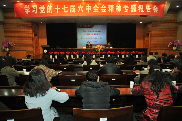 12月12日下午,省委宣传部常务副部长、党的十七届六中全会精神省委宣讲团成员胡坚应邀来到我校,为师生作了题为《学习十七届六中全会精神,大力推进文化强国建设》的专题辅导报告。校党委书记于永明主持报告会。学校中层及以上干部、二级中心组成员、教工党支部书记、中层后备干部、思政教师、辅导员、党群部门全体工作人员和思政研究生等200余人参加了报告会。