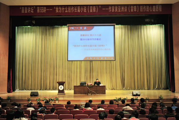 “雷锋”这两字,今天还值不值得说?雷锋精神,在今天还有多大的市场?有关雷锋的文学作品,今天还值不值得写?3月31日晚,著名作家黄亚洲先生应我校图书馆邀请,作客“嘉量讲坛”,并作为学校“2012读书节讲座活动”的首位嘉宾,为师生作了“我为什么创作长篇小说《雷锋》――谈创作的心路历程”的精彩讲座。1200余名师生一起分享了黄亚洲先生的雷锋精神之旅。