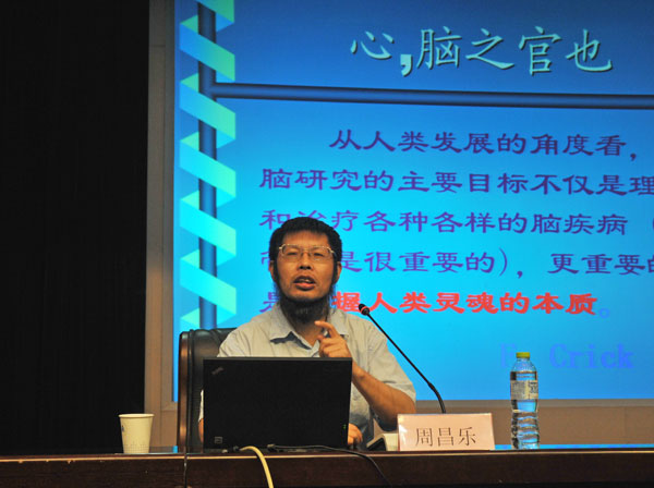 讲座中,周昌乐宏观介绍了脑科学研究的基本内容、研究方法及研究现状,并从脑科学研究的基本命题、自我意识、意义产生机制、万事均缘于脑四方面深入阐释了脑科学及其人文应用,在此基础上,探讨了脑科学在自我意识、神经美学、意识理论、禅悟实证、他心知等问题的实证研究。他强调,脑科学的发展将深深影响并改变我们的文化与生活,“心,脑之官也”,从人类发展的角度看,大脑研究的主要目标不仅是理解和治疗各种疾病,更重要的是掌握人类灵魂的本质。