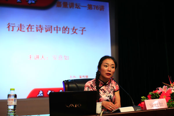 讲座中,安意如讲述了古典诗词对她成长的影响、她对古典诗词的领悟以及古典诗词如何让她成为今天的安意如。从晏殊父子到白居易的人生际遇,从屈原到龚自珍的家国情怀,从小饱读诗书的她对于古典诗词的典故与深意娓娓道来,如数家珍。她说,“行走在诗词中”就是要从经典的、精彩的古典诗词中学领悟到积极坦然的人生态度和心怀天下的社会意识。她认为古典诗词除了风花雪月、儿女情长的温婉缠绵外,还有更为厚重的家国天下、任重道远的远大情怀。对于外界给予她的诸多评论,她回应道,“行走”是一种严谨认真,亦是一种潇洒姿态。人生是一场修行,唯有淡然平和,才能领悟到人生的至美境界。