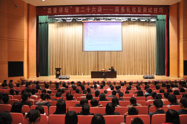 你会握手吗?你会鼓掌吗?你懂得怎样介绍自己吗?3月30日晚,嘉量大会堂座无虚席,一场全校学生党员深入学习实践科学发展观活动的报告会在这里举行。学校邀请了资深的人力资源专家、杭州三惠商务咨询有限公司总经理王皓珺为同学们作了一场《商务礼仪及面试技巧》的讲座,这也是学校嘉量讲坛第26讲。