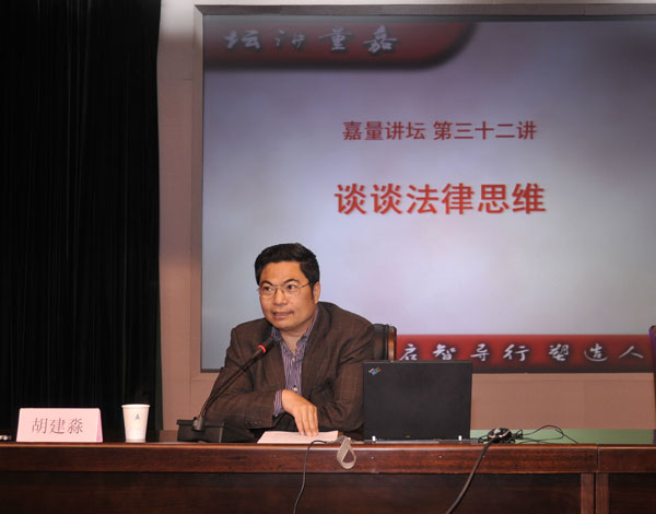 胡校长的讲座以“谈谈法律思维”为题,从什么是法律思维,法律思维是什么两个方面展开。胡校长指出,法律思维是根据一个人的法律职业或法律学科的背景自觉或不自觉形成的一种思维方式。它有弊也有利,总体来说,法律思维在社会发展中越来越重要。特别是在现代社会管理中,法律思维越来越受到重视。在讲座中,从《威尼斯商人》中的经典故事到母亲怎么给两个孩子公平地分蛋糕,胡校长将一个个生动的案例和事例信手拈来,深入浅出地介绍了法律思维的表现和特点。他认为,法律思维强调立法先行;强调契约观念;强调分立思维;强调批评思维;强调程序;强调证据性和依据性;强调直接性、充分性、联接性、准确性。同时,他也希望同学们在能够形成这些法律思维中值得赞赏的优势思维的同时,还要多些建设性思维。