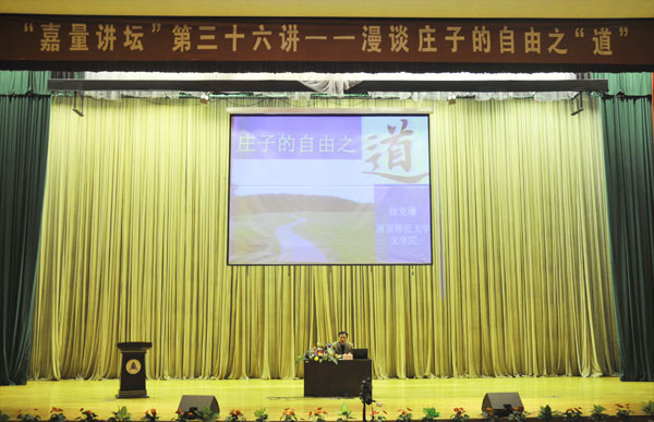 4月22日下午2:00,由宣传部、图书馆、校团委、人文社科学院和外国语学院主办的“嘉量讲坛”第36讲——《漫谈庄子的自由之“道”》在嘉量大会堂开讲。本场讲座由南京师范大学文学院教授,博士生导师徐克谦教授主讲。在一个多小时的讲座中,徐克谦教授以学者特有的渊博与睿智,给在场的听众带来了一场意蕴丰厚的文化盛宴。