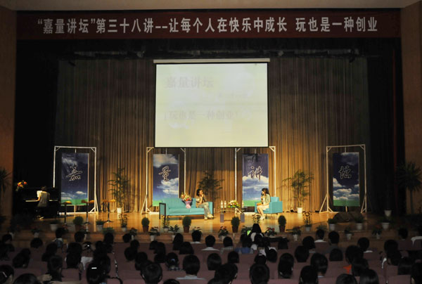 6月12日晚6:30,嘉量讲坛迎来了一位特殊的客人——80后财富新贵茅侃侃。此次讲坛由校党委宣传部、校团委主办,光学与电子科技学院承办,题目为“让每一个人快乐成长”。本次讲坛首次采用了访谈的形式。主持人和嘉宾精彩互动,茅侃侃幽默风趣、个性十足的回答,为大家很好地诠释了“玩也是一种创业”的主题。来自下沙各高校的同学近千人参加了本次讲坛。