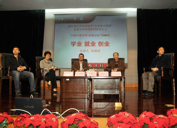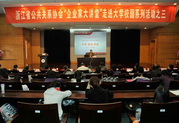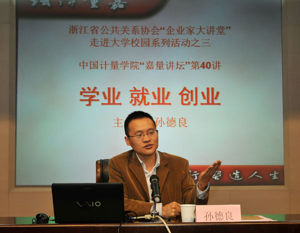 10月16日上午,浙江省公共关系协会“企业家大讲堂”走进大学校园系列活动之三暨“嘉量讲坛”第40讲在我校闻厅二楼小报告厅举行。本次活动由党委宣传部、校团委和人文社科学院共同举办。浙江网盛生意宝股份有限公司总裁、浙大MBA研究生导师孙德良畅谈了自己对学业、就业和创业的体会。
