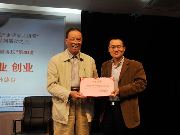 浙江省公关协会会长周行对此次讲座进行了总结,指出孙德良总裁靠知识和智慧创造财富,走出了一条发展之路的经历,一定会给广大大学生带来启迪,希望大学生们能从中受益,为自己走向社会,今后成功就业和创业打好基础。周行会长还向孙德良先生颁发了聘书,聘请其担任高校大学生创业荣誉导师。