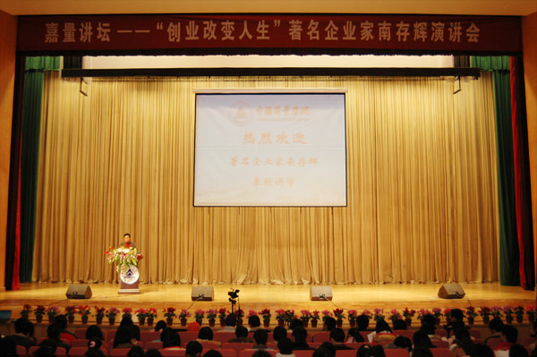 应我校和《浙商》杂志社共同邀请,南存辉,这位世人公认的“新温州模式”的积极探索者和杰出代表,被誉为“中国新兴民企代言人”的著名企业家,于12月30日晚做客“嘉量讲坛”,与我校师生共同分享了他的创业之路。当晚的嘉量大会堂人头攒动,座无虚席。在1200余名师生期待的目光中,浙江正泰集团公司董事长兼总裁南存辉先生走上嘉量讲坛,为师生们带来了一场精彩的演讲。