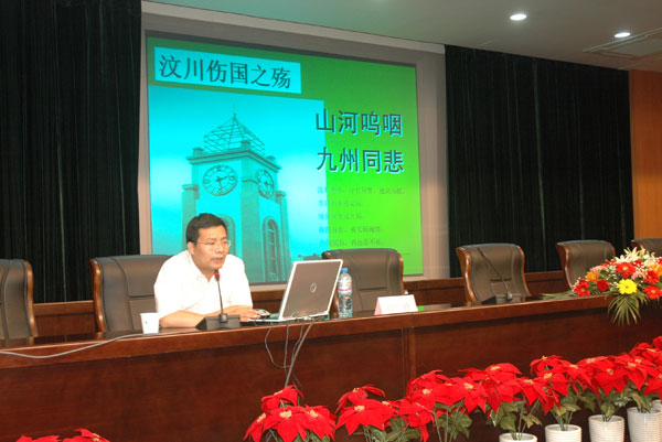 一副副撼动心灵的图片,一段段感人至深的文字,顾俊峰老师通过生动形象的PPT演示引出了此次讲座的主题——《大学生如何面对灾难及心理危机干预》。结合自己在四川灾区心理救助工作中积累的个案经验,顾俊峰为大家讲述了地震对人们心理影响的特殊性、受灾者可能出现的心理反应,尤其是大学生群体和儿童群体可能出现的心理危机问题,强调了进行心理危机干预的必要性和重要性,并为大家重点讲解了居丧干预的目的、原则和策略。