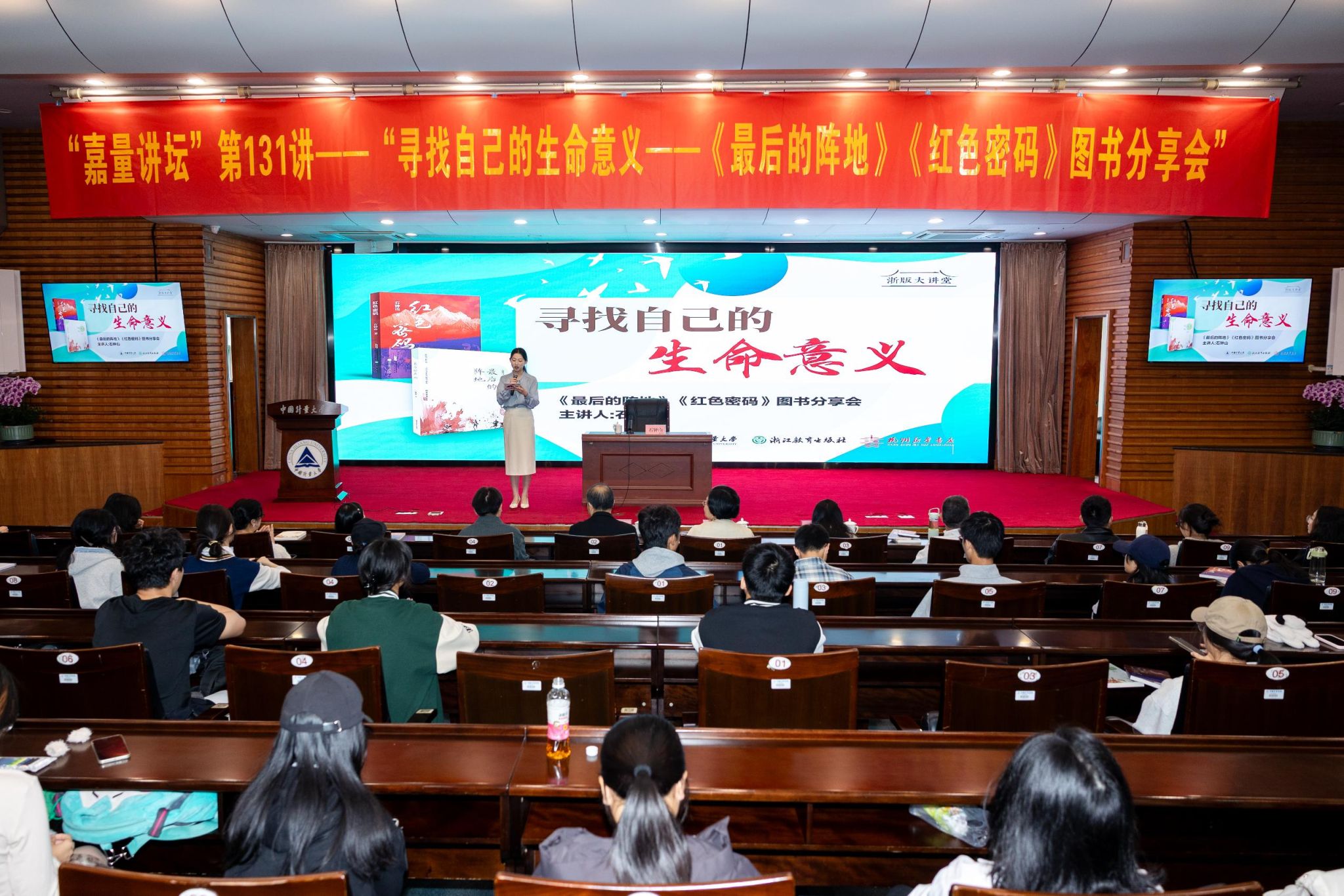 10月26日,中国计量大学图书馆(档案馆、博物馆)与宣传部联合主办的“嘉量讲坛”第131讲在闻厅二楼报告厅举行。本次活动特邀中国当代著名作家、编剧石钟山担任主讲嘉宾,以《寻找自己的生命意义——〈最后的阵地〉〈红色密码〉图书分享会》为主题,为现场300余位师生带来了一场兼具文学魅力与思想深度的红色文化盛宴。