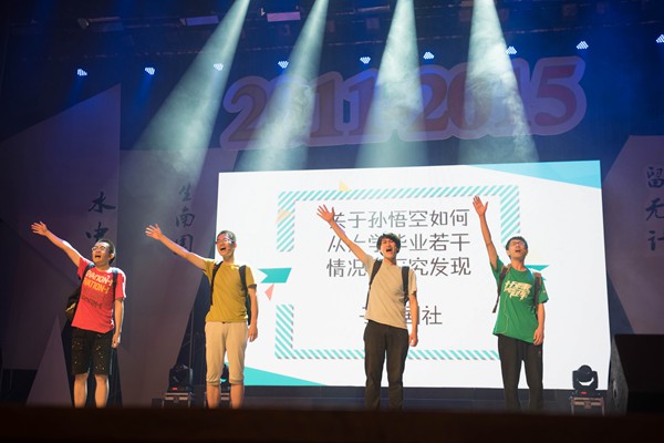 在记录着计量的每一个角落和四年来无数个动人场景的视频里,晚会拉开了序幕。随着校器乐团演奏的欢快旋律《欢乐的时光》,校舞蹈团的成员们带着墨镜,用节奏明快的舞蹈让每一个在场的人想起了四年来与身边好友度过的快乐时光。随后是一支投身于新疆志愿者活动的乐队“高原与其他人”带来的歌曲。主唱高原寄情于《红与黑》,在这首对他本人而言意义重大的歌曲里诉说着离别与爱。