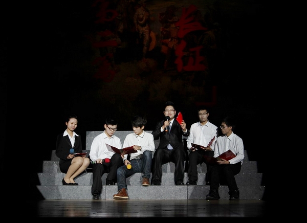 在晚会第三篇章,胡建成书记为在场的同学们朗诵了毛主席长征期间的经典作品《沁园春·雪》与《长征》,气势庞大、抑扬顿挫的朗诵鼓舞着同学们,现场掌声不断。在第五篇章,胡书记再次倾情登场,一气呵成,为大家带来了《七律(二首)·送瘟神》、《满江红·和郭沫若同志》、《咏梅》等毛主席著名的诗词,并与参演同学合诵了毛主席1965年重上井冈山时的作品《水调歌头·重上井冈山》,慷慨激昂的朗诵再次赢得经久不息的掌声。