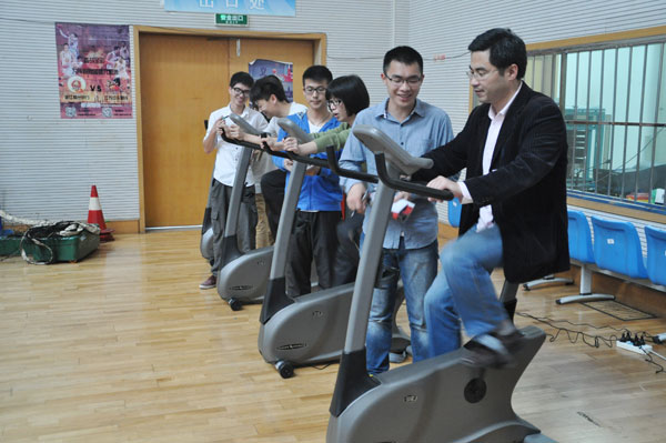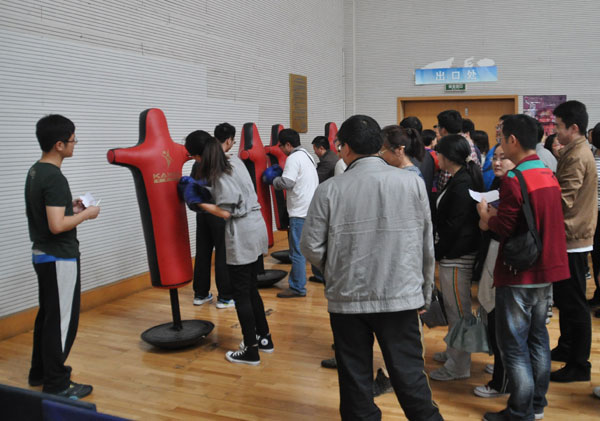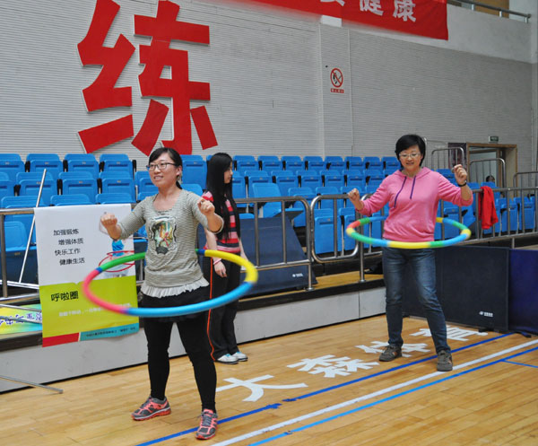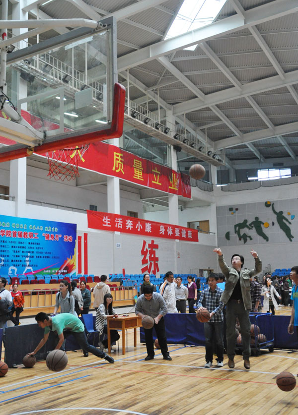 热闹的热身运动后立即进入“健身月”活动的第一个单元:教工健身娱乐活动。活动设击沙袋、定点投篮、动感单车、跳绳、呼啦圈、踢毽子六个项目,每个项目设定了达标参数。教工们参与热情极高,个个磨拳擦掌,跃跃欲试。击沙袋、定点投篮、动感单车这三个项目男教工在体力上占优,达标设置的条件也比女教工高。这些项目也吸引了众多女教工参与。击沙袋时力量不够,女教工们就以捶打式力拼击打数量,一分钟击打一两百次轻松搞定,相比之下,一旁“大打出手”的男教工则累得气喘吁吁,场面十分有趣。动感单车体验所有参加者都达标,最快的一分钟能骑行近1500百米,定点投篮也惊现百发百中的好手。以技巧见长的跳绳、呼啦圈、踢毽子项目也频见男教工的身影并且不乏高手,最快的男教工一分钟跳绳达200余次,幸而绳上有计数装置,否则很难计数,只看到无形的光影伴随“嗖嗖”声的在眼前快速闪过,令人折服。呼啦圈快速旋转形成的五彩光环绚丽多彩,毽子在空中划出一道道美丽的弧线令人心驰神往……活动现场气氛热烈、笑声不断。校工会还为参加活动的教工准备了纪念品,整个下午教工们玩得开心、过得充实。