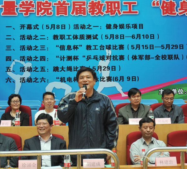 林建忠校长在致辞中生动而精辟地阐述了体育运动对人类的四大益处:益体、益智、益心、益情。他指出,体育运动能促进新陈代谢、减少体内脂肪积累、降低血糖、防止骨质疏松、增强肌肉力量、提高睡眠质量、保持精力充沛和练就理想体格,所谓“益体”;体育运动可以促进脑细胞生长,给大脑提供营养和氧气,提高思维力、记忆力,还可以磨练智力,所谓“益智”;体育运动能强化人的目标感、超越感、创新感,体育比赛能磨练人的坚韧品质、提高心理素质,体育规则能促进人的标准意识,体育成绩能增强人的计量意识,所谓“益心”;体育运动的群体性能够促进协作、提高情商,其娱乐性能增强积极性和乐观感,其刺激性能激发人类内心潜在的狂热和痴迷,其异态性能使人在常态下保持平常心,其观赏性能增加生活情趣,所谓“益情”。林建忠号召全体教职员工积极投入体育健身活动中,共同延长生命的长度,增加生命的厚度。