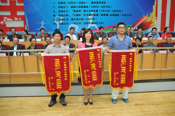 校领导代表组委会给机电工程学院、信息工程学院、计量测试工程学院三个赞助单位赠送了锦旗。