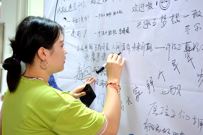 红色地贴的终点处是右侧的励志教育区,新生在此处郑重写下自己的愿望和奋斗目标,投入“时光邮筒”。来自测控技术与仪器专业的陈谊哲表示,“希望我可以在大学四年里好好努力,学好本专业的课程,在大四时争取考研”。