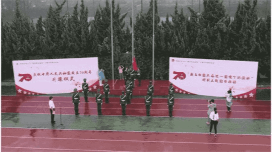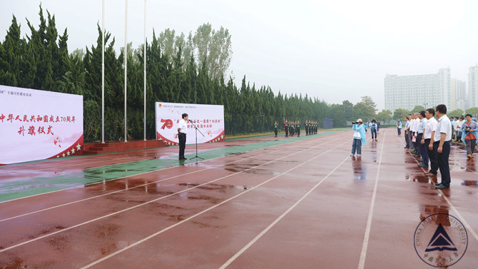 10月1日早晨8时,在北操场,学校全体党政领导班子、各学院负责人与近千名学生代表汇聚在一起,举行庄严神圣的庆国庆升国旗仪式。活动由党委副书记程刚主持。师生们统一着浅色上衣,深色下装,庄严而肃穆。我校学子们脸颊两侧贴着鲜红的五星红旗贴纸,深情而炽热地凝望着国旗缓缓升起的地方。