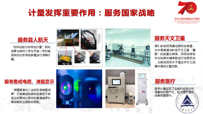 他向同学们展示计量在服务国家战略过程中发挥着越来越重要的作用:为北斗导航系统提供地面基准钟、在欧亚链路首次实现时频传递、为三峡发电效率评价提供支持……计量还服务载人航天,比如“材料反射分布特性计量”研究成果为神州八号与天宫一号对接系统的光学系统参量进行准确计量。突破永磁材料高温测量技术可以破解企业急需的测量难题,能源计量与管理控制系统能为企业节能环保服务。