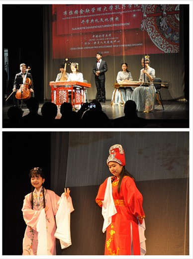 2019年11月14日,我校在布拉格市中心Mana Divadlo歌剧院隆重举行浙江-捷克人文交流中心暨布拉格金融管理大学孔子学院开学典礼文化演出活动。中国驻捷克大使张建敏、中国驻捷克大使馆教育组负责人赵长涛、我校校长宋明顺、布拉格金融管理大学校长波沪斯拉娃·申基洛娃、捷中友好合作协会执行副会长彼得·莫哈雷克等嘉宾,欧洲华捷发展有限公司董事长张凤德等捷克浙资企业代表和布拉格金融管理大学师生等170余人观看文化演出活动。