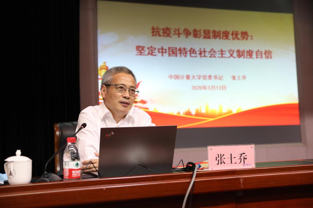 张土乔带着同学们重温了2004年时任浙江省委书记的习近平视察当时中国计量学院的情景,强调了计量在服务国家战略过程中的重要作用,列举了从宋明顺、俞晓平、陈乐、徐沛、伍义行等教授,到7000余名奋战在一线的市场监管系统的量大毕业生,在此次抗疫斗争中体现出的量大人的担当与贡献。