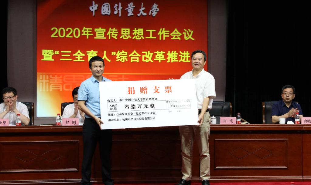 大会还进行了党建思政专项奖教金捐赠仪式。在我校发展委员会副主任、校友总会会长冯时林的沟通联络下,杭州申昊科技股份有限公司向我校捐赠30万元,设立仕林发展基金“党建思政专项奖”,专门用于鼓舞和激励广大党建思政工作者加强自身修养、忠诚党的教育事业,开拓创新,尽心履职,助力学生成长成才。杭州申昊科技股份有限公司总经理黎勇跃代表企业向学校捐赠,党委副书记肖刚代表学校接受捐赠,并向黎勇跃总经理颁发了捐赠证书。