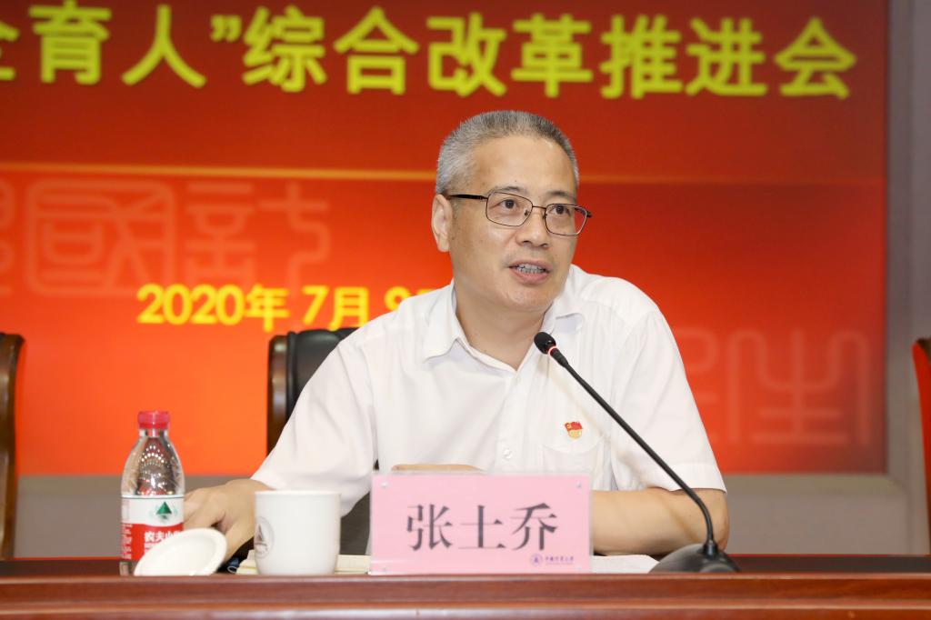 张土乔强调,推动“三全育人”,是新时代中国特色社会主义高等教育的生动实践,是学校全体师生增强“四个意识”、坚定“四个自信”、坚决做到“两个维护”的生动实践。我们要聚焦立德树人根本任务,进一步确立“三全育人”新理念、新思路;要强化目标导向、问题导向,进一步推动“三全育人”往深里走、实里走;要激发育人意识、育人能力,进一步提升“三全育人”工作针对性、有效性。他号召全校上下坚定主心骨、汇聚正能量、振奋精气神,争当“重要窗口”建设的参与者、实践者、推动者,奋力开创学校宣传思想工作的新局面,全面提升思想政治工作质量,用习近平新时代中国特色社会主义思想铸魂育人,为学校发展提供强大的思想保证和精神动力,为建设特色鲜明的高水平大学贡献更大力量。