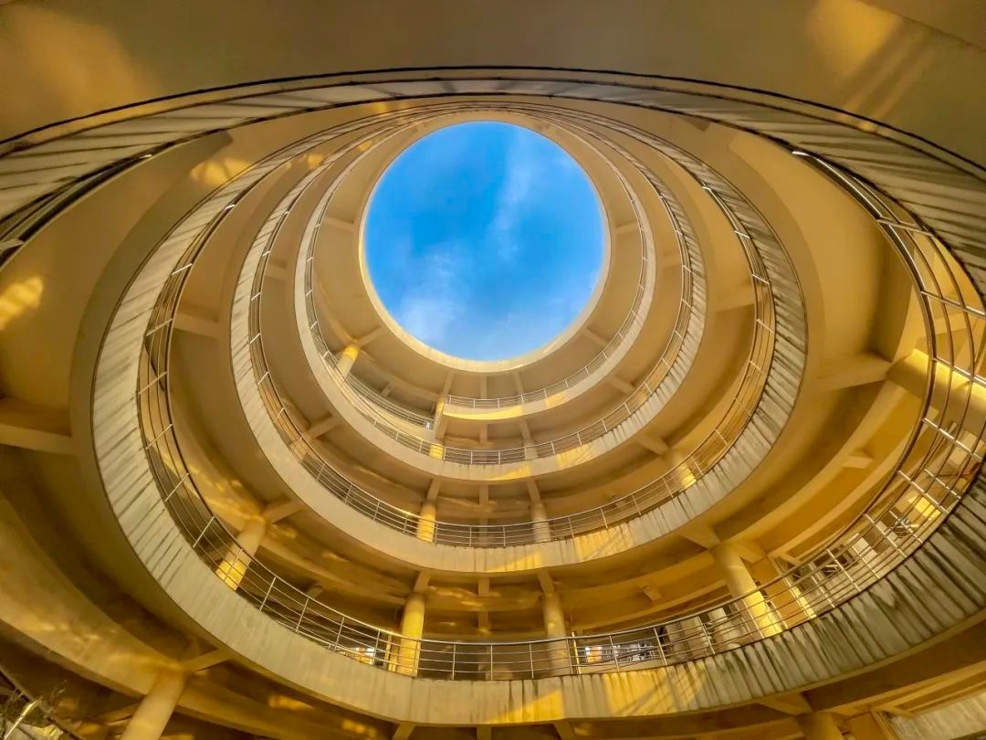 建筑景观。该景观位于西教学区环宇楼西侧,是为残障人士设置的环形坡状楼梯。“环”状凸显其外形特点,盘旋六圈直达顶楼。从绿植掩映的一楼环形坡状楼梯起步,举目仰望,但见楼梯螺旋上升,视界中心直指天宇,象征莘莘学子志在环宇,叩问苍穹,其求知过程亦如螺旋上升,堪称量大校园励志景观。
